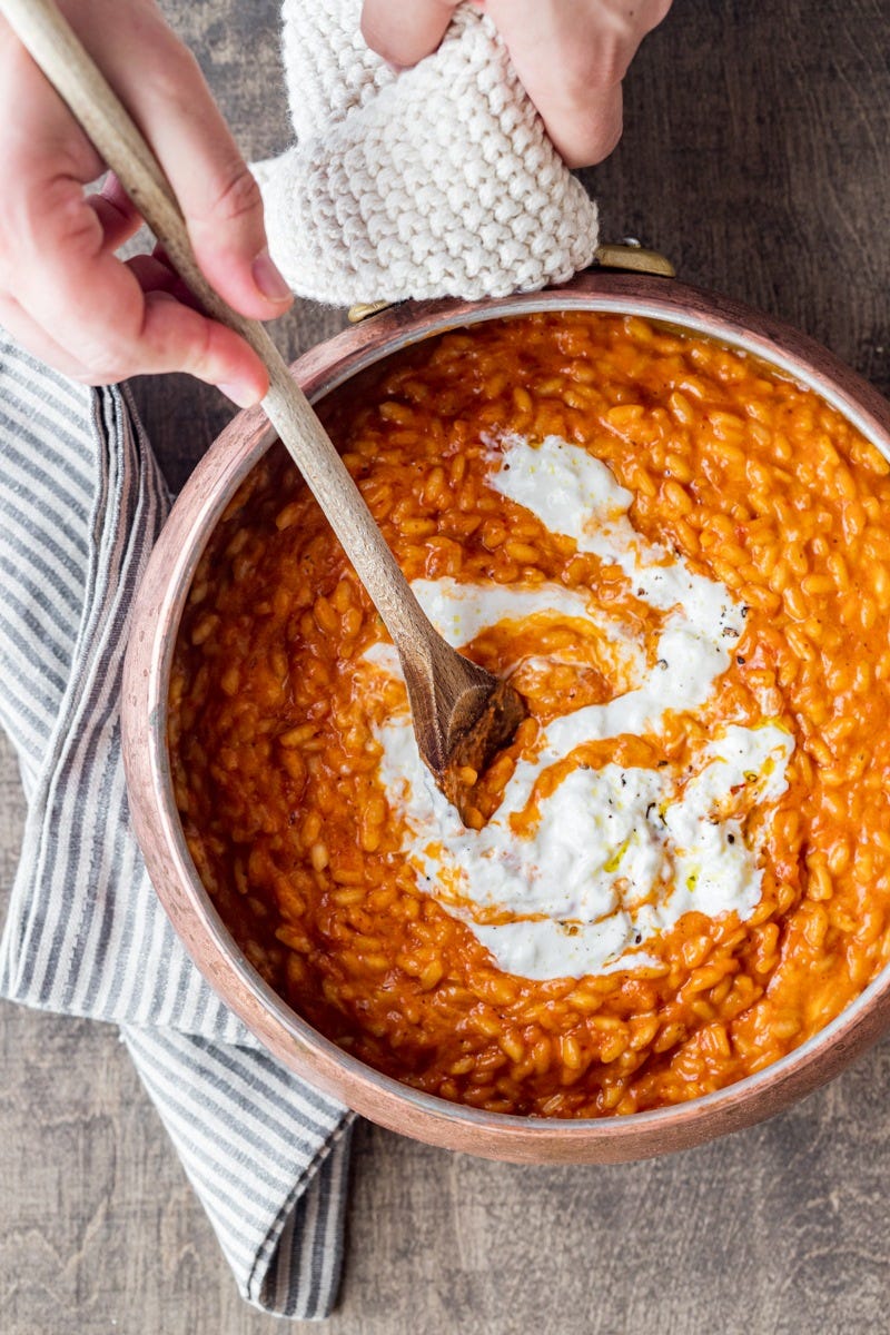 Roasted tomato risotto. I was a picky eater. Would you believe it? I used to eat lunch at school and it felt like torture. That giant snail shell pasta with tomato sauce, dried out with a shower of grated Parmigiano, seemed to multiply in my plate. Not to mention the wilted green salad. There was one dish, though, that I would eat with dedication: it was a humble tomato risotto. Probably because my mum and grandma never made it at home, it was somehow special.