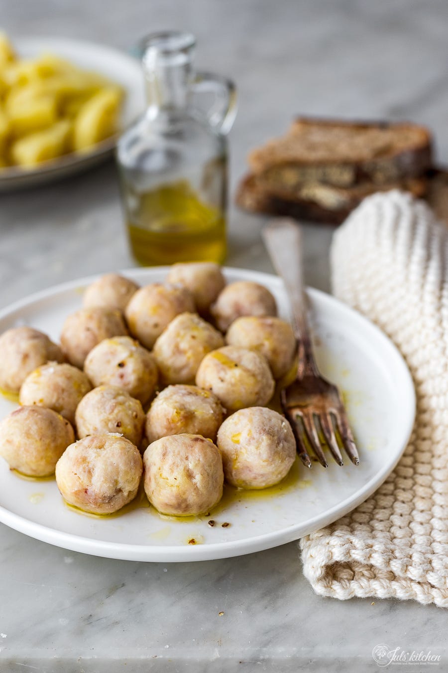 Tiny, delicate, with a simple flavour, they were made with ground chicken meat, potatoes, and grated Parmigiano Reggiano: 3 or 4 meatballs would be enough to cover up a whole meal for my sister. I was so happy every time mum cooked the chicken meatballs for Claudia.