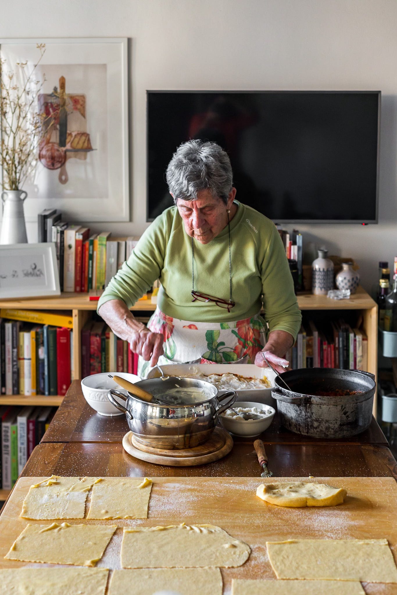 She grew up in the countryside, in this very house where we’re living now, in a peasant family. She learnt to cook from the many women in her family — milk pudding from Zia Antonietta, meat sauce with rabbit liver from her mum — but also from those home cooks who would travel from household to household during threshing or grape harvest time, helping families lay out thank-you banquets for the neighbours who had come to lend a hand in the fields.