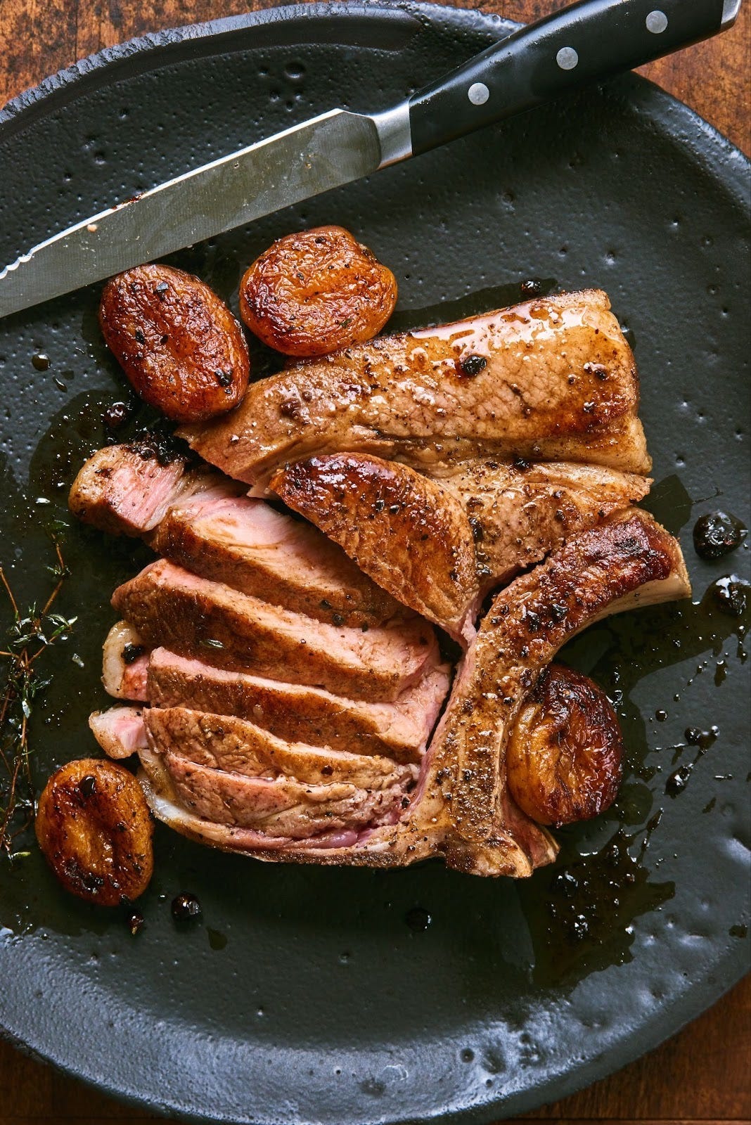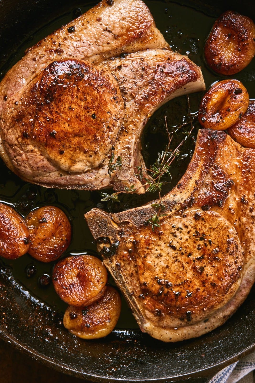 Turn the pork chops to the second side, add the apricots and thyme sprig bundle, and baste the chops in hot fat for 30 seconds. Turn the apricots after 30 seconds to 1 minute, once they become burnished and golden. Cook the chops for one more minute for medium, then transfer them and the apricots to a serving platter, allowing the meat to rest for 5 minutes.