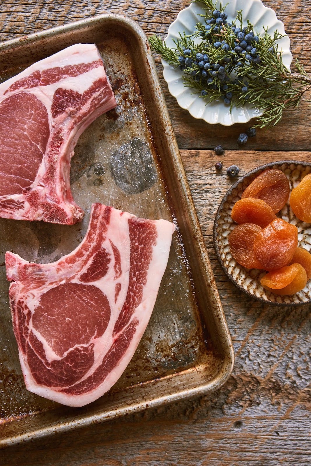 Today, I’m sharing a brand-new recipe - juniper pork chops with pillowy apricots.