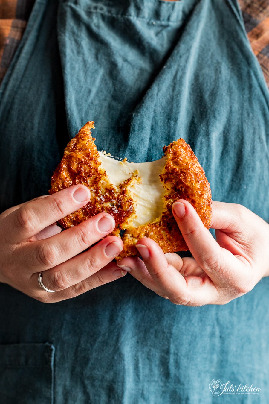 Mozzarella in carrozza is one of the dishes that better represents for me the ’80s and my childhood, the special dinner that mum would allow us once a month, crisp on the outside with a heart of melting mozzarella. You were supposed to eat it while still hot, so hot that it would burn your fingers and tongue… though it was impossible to wait.
