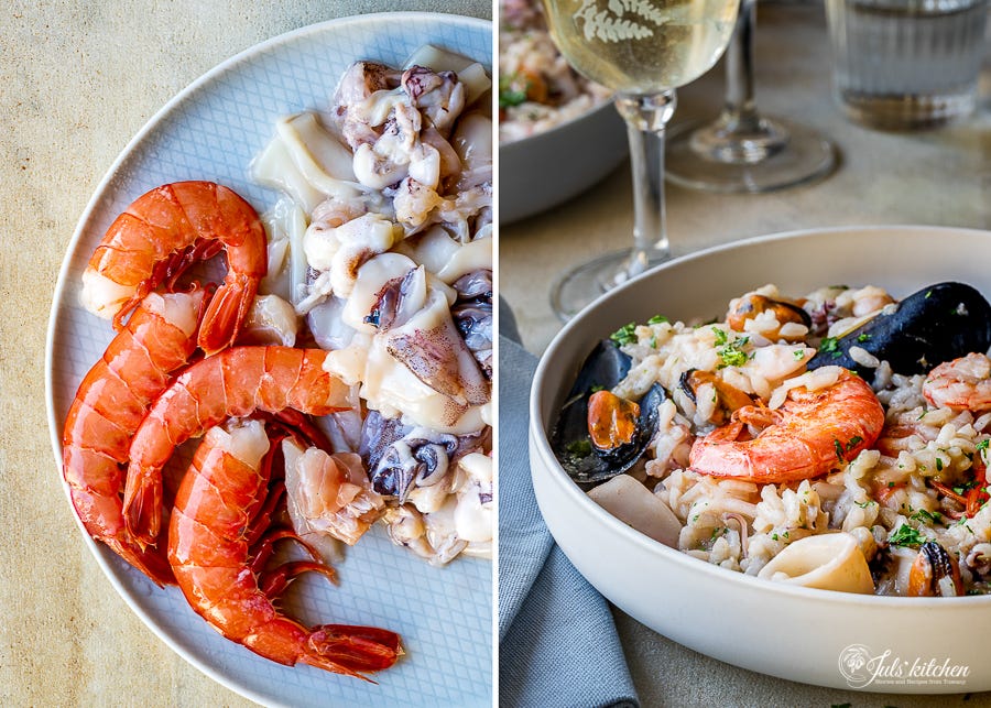 Last week I went to the market to buy a seasonal vegetable to make risotto – radicchio, or maybe the first asparagus from the coast? -, but then I saw the fish stall, and it happened, it became a seafood risotto.