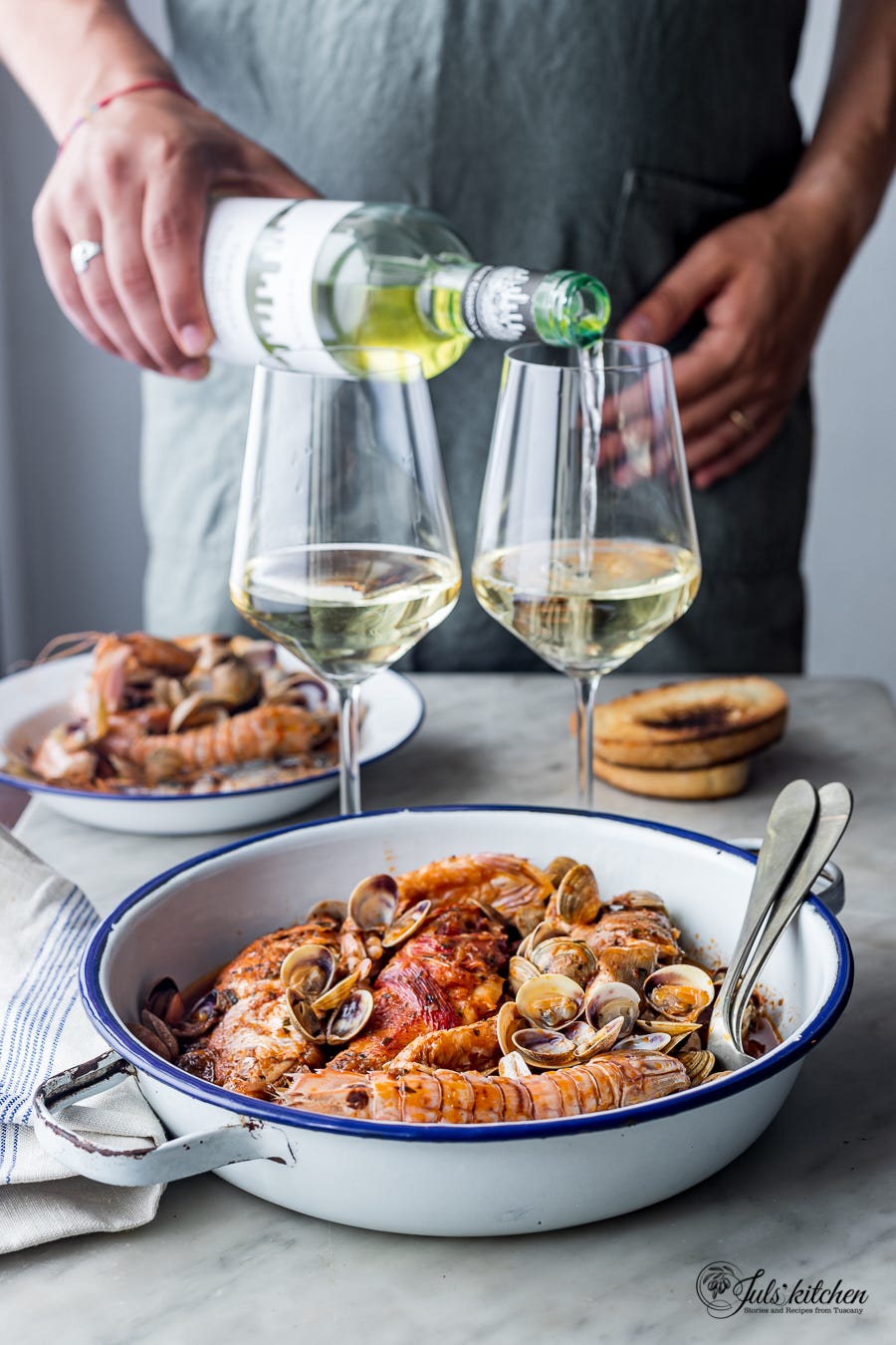 Almost every Italian region that faces the sea has its own version, from the cacciucco from Livorno to the Ligurian buridda, from the Adriatic brodetto to the quatara from Porto Cesareo, in Salento, a soup that Tommy’s uncle prepared for us during our holidays there.